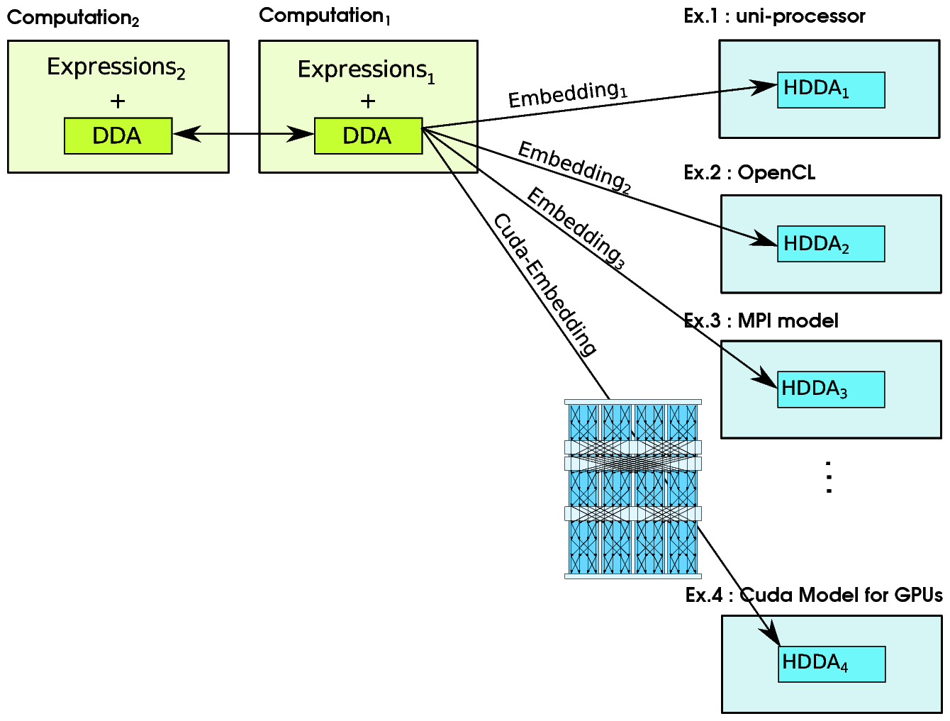 Portability: In the figure, DDA + Expression is hardware independent. Embeddings onto various hardware is defined from the DDA, and is thus reusable when the DDA is reused.